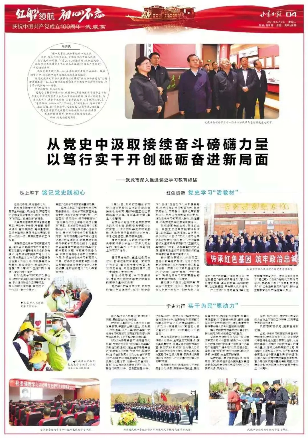 当前,党史学习教育的热潮在凉州大地涌动,武威全市上下以习近平新时代中国特色社会主义思想为指引,从党的百年非凡历程中汲取接续奋斗的精神力量,以信仰之光照亮前行之路,用如磐初心凝聚奋斗伟力,努力打造河西走廊经济社会高质量发展“桥头堡”和丝绸之路经济带甘肃段重要节点城市,奋力开创武威高质量发展新局面,以实绩实效和优异成绩庆祝中国共产党成立100周年。