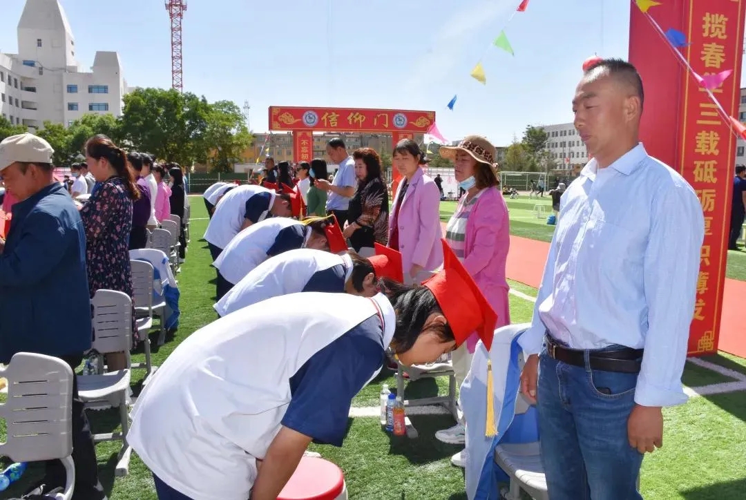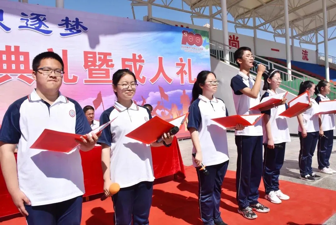 “谁言寸草心,报得三春晖。”仪式上,家长们为孩子佩戴校徽、整理成人帽,孩子们向家长恭行拜谢礼,感恩父母之养育。之后,同学们高举右拳,在国旗下庄严宣誓:“热心奉献社会,无愧祖国培育;立志奋发有为,不负人民厚望;以我火红青春,建设锦绣中华;以我壮志激情,创造崭新未来。”宣誓后,家长和孩子手挽手在青春宣言墙签名,郑重走过了成人门、成才门、信仰门。