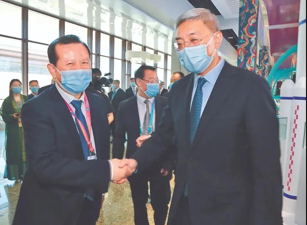 9月24日上午,省委书记、省人大常委会主任尹弘在参观商品展时,与市委书记柳鹏亲切交谈。