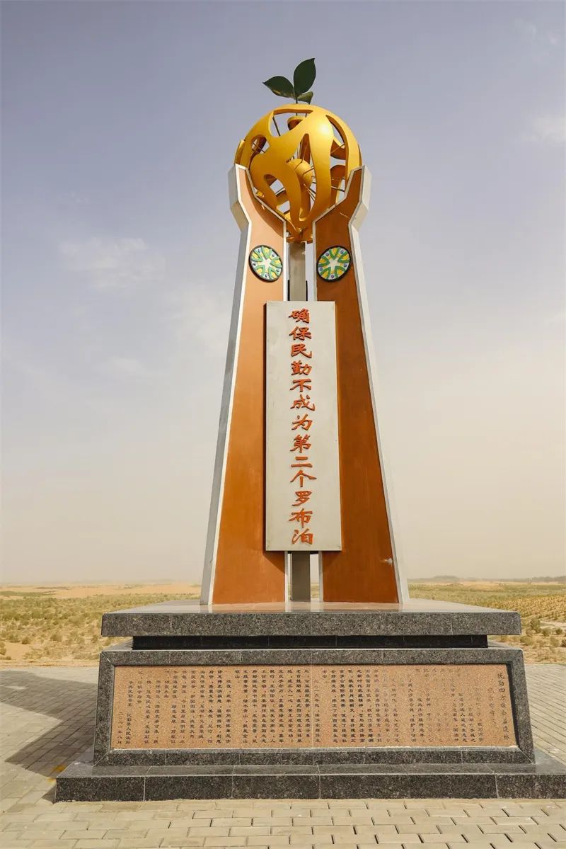 在民勤县四方墩生态林基地中,有一个众志成城志愿治沙纪念碑。碑身下部为三只手臂的支撑结构,上部为球形结构。三只手臂象征各地志愿者们通过不同方式参与防沙治沙,也有压沙、造林、管护三项措施共同完成生态治理的寓意。球形结构由象征沙漠的球形雕塑、顶部伸出的绿色幼苗、内部的心形种子三部分构成,象征志愿者们过去十余年的不懈付出。
