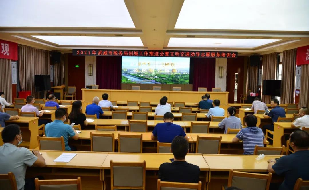 8月12日,武威市税务局召开2021年创城工作推进会暨文明交通劝导志愿服务培训会。会议传达了市委、市政府创建全国文明城市推进会会议精神和凉州区西大街创城工作包抓共建暨整改工作推进会会议精神。