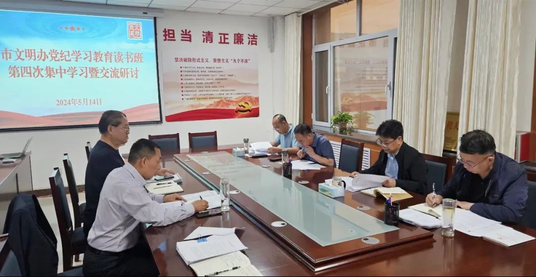 5月14日,市文明办举行党纪学习教育读书班第四次集中学习,市文明办班子成员、各科组负责同志集中学习了中央层面党纪学习教育工作专班《党纪学习教育有关问题答复(二)》等内容,班子成员围绕这次读书班集中学习的内容进行了交流研讨。市文明办主任赵磊同志主持并讲话。