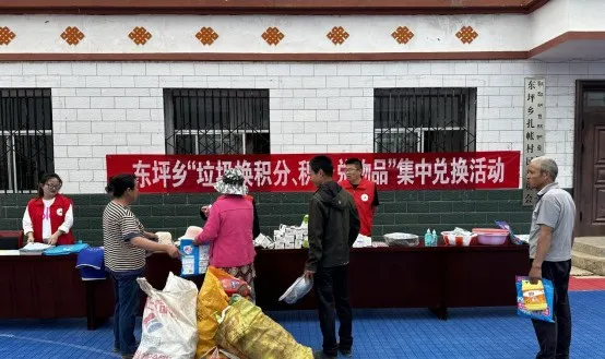 东坪乡持续在各村流动开展垃圾换积分、积分换物品兑换活动,活动现场农牧民群众拎着日常捡来的饮料瓶、塑料袋等生活垃圾来兑换生活物品。兑换现场村民们高兴地说:我们在日常生产生活中捡到的垃圾都换成积分,积分兑换成生活中的小物品,真是太好了。